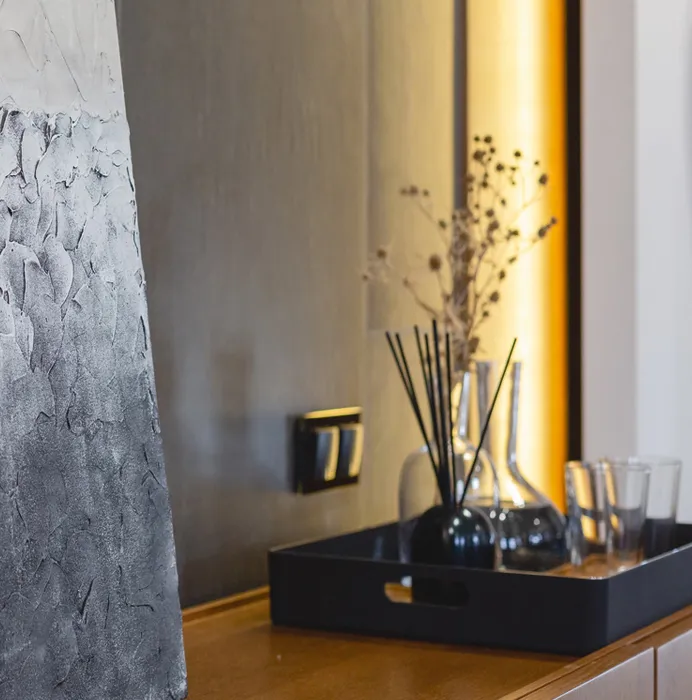 Особое внимание уделили электроустановочным изделиям. Дизайнеры выбрали продукцию торговой марки Werkel™, которая стала важным элементом интерьера. Эффектные рамки из закаленного стекла в черном и белом цветах подчеркнули минималистичный стиль комнаты. Розетки и выключатели гармонично дополнили рамки, создав единый гармоничный тандем, который не только функционален, но и эстетичен.